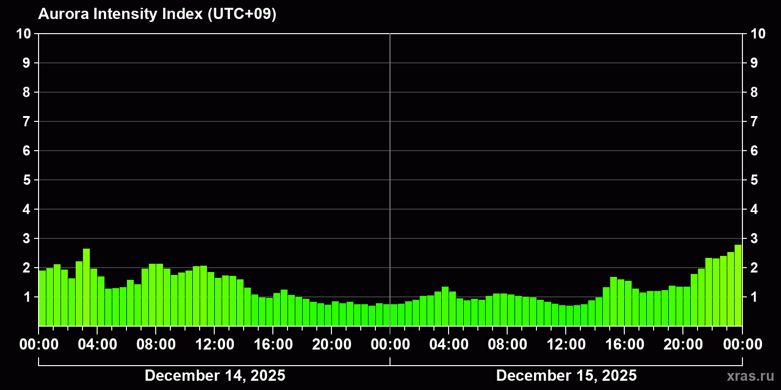 Auroral intensity index and the theoretically possible latitude of observations for nighttime in the Estern Hemisphere as of 2025-12-15 23:47 (end of day) local time