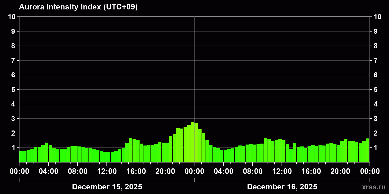 Changes in the auroral intensity index from 2025-12-15 to 2025-12-16 local time