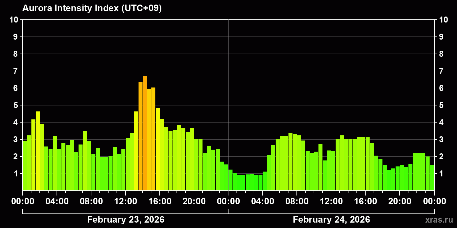 Auroral intensity index and the theoretically possible latitude of observations for nighttime in the Estern Hemisphere as of 2026-02-24 23:52 (end of day) local time
