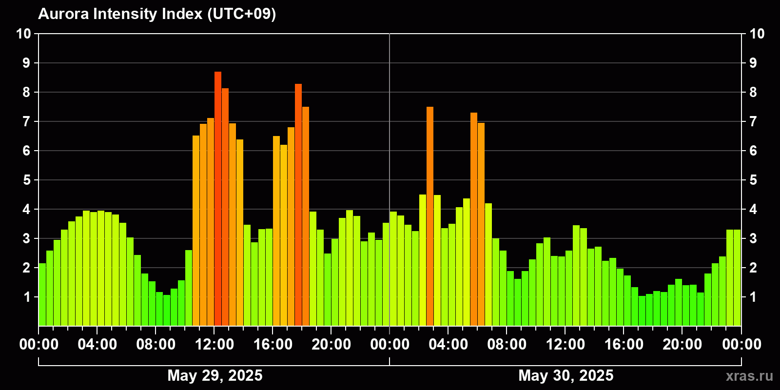Changes in the auroral intensity index from 2025-05-29 to 2025-05-30 local time