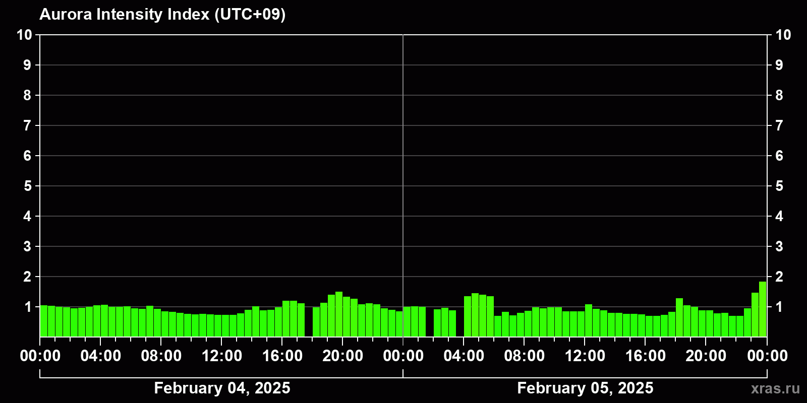 Changes in the auroral intensity index from 2025-02-04 to 2025-02-05 local time