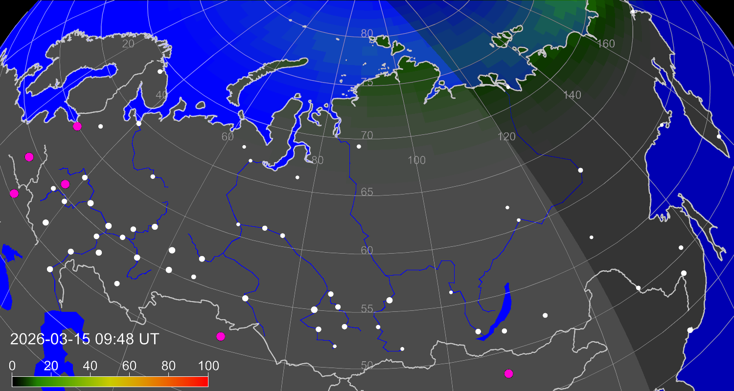 Индекс интенсивности полярных сияний и теоретически возможная широта наблюдений для ночного времени в восточном полушарии