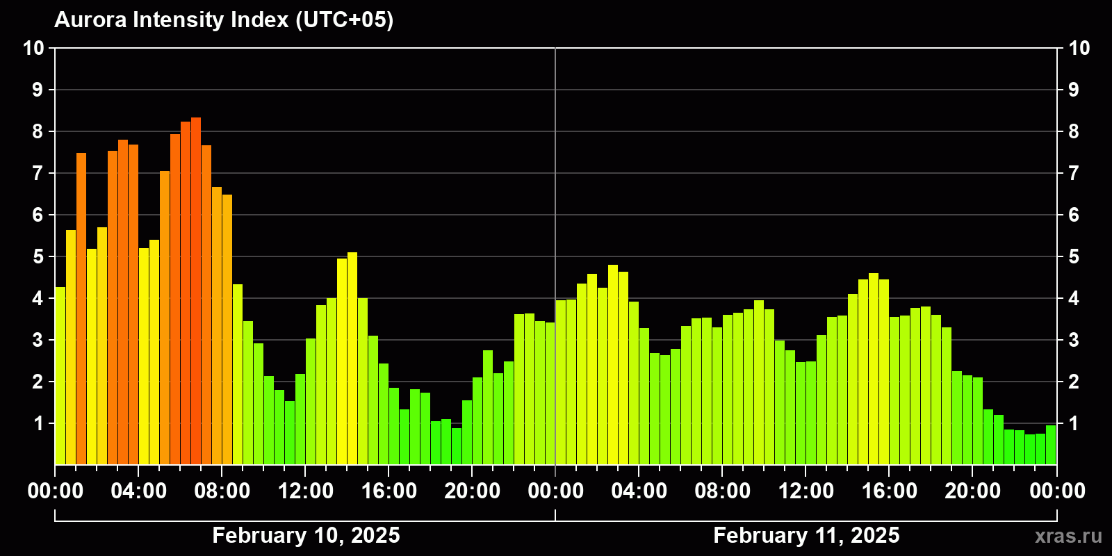 Auroral intensity index and the theoretically possible latitude of observations for nighttime in the Estern Hemisphere as of 2025-02-11 23:57 (end of day) local time