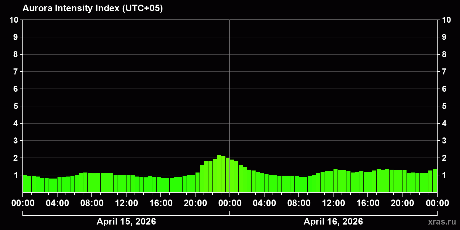 Changes in the auroral intensity index from 2026-04-15 to 2026-04-16 local time