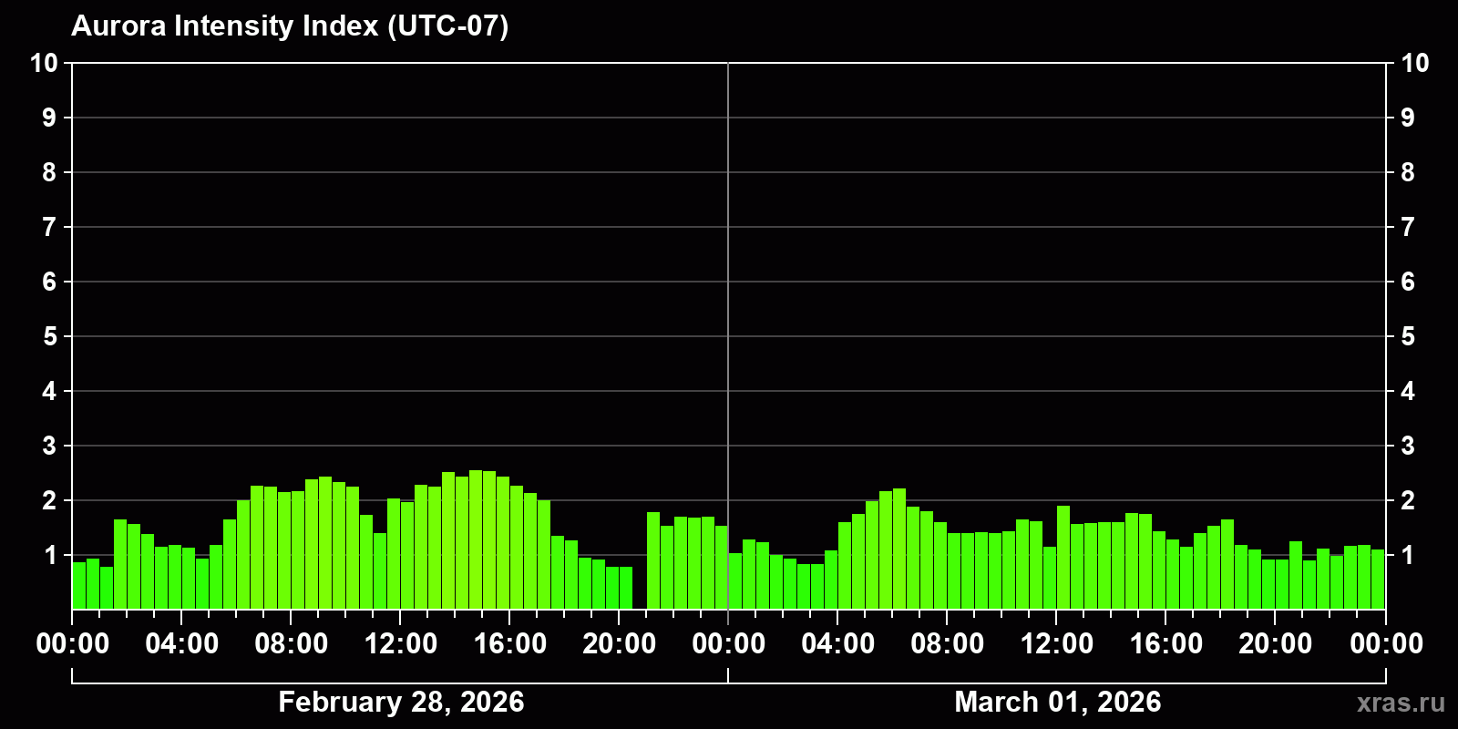 Auroral intensity index and the theoretically possible latitude of observations for nighttime in the Western Hemisphere as of 2026-03-01 23:58 (end of day) local time