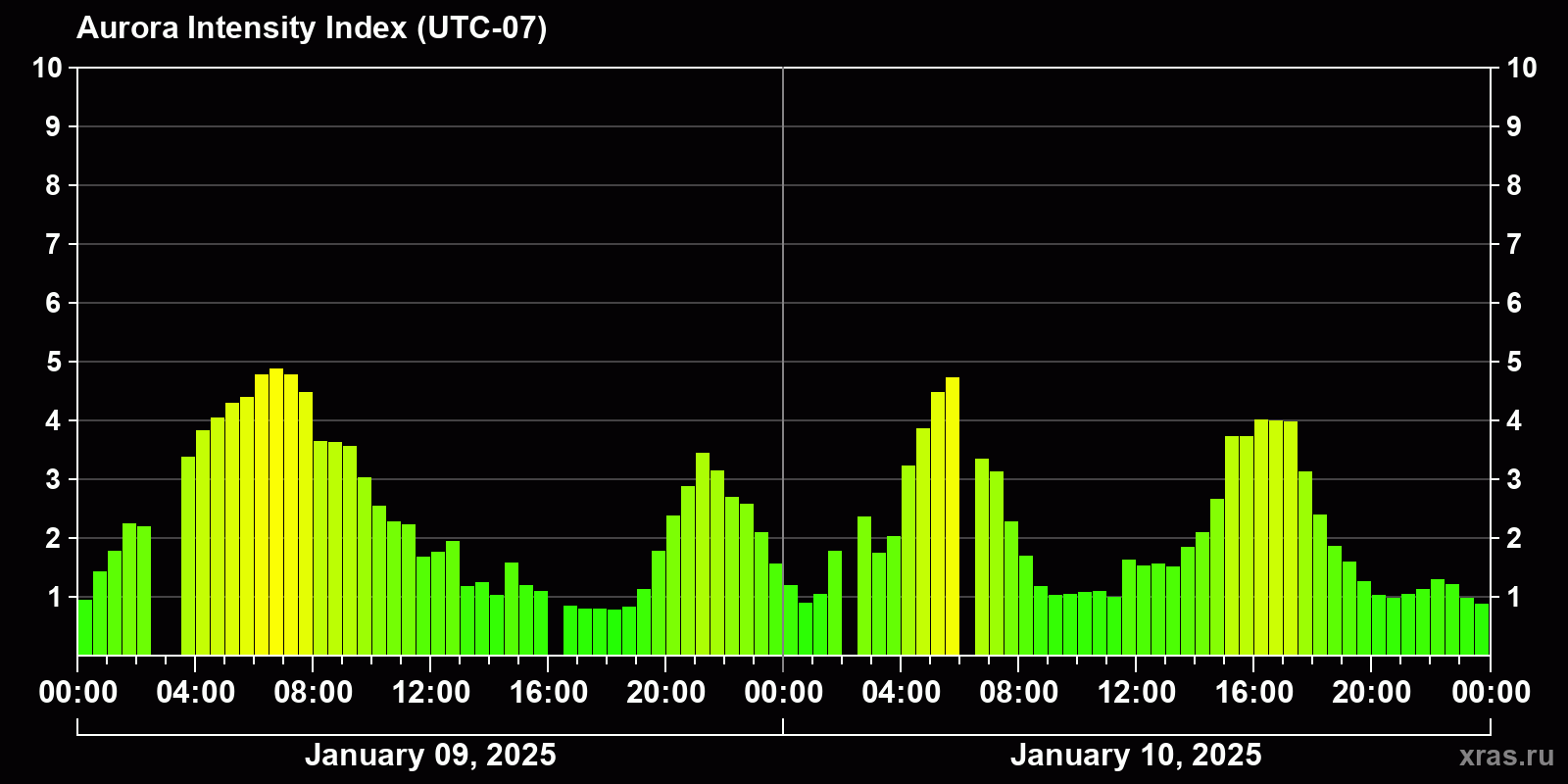 Auroral intensity index and the theoretically possible latitude of observations for nighttime in the Western Hemisphere as of 2025-01-10 23:46 (end of day) local time