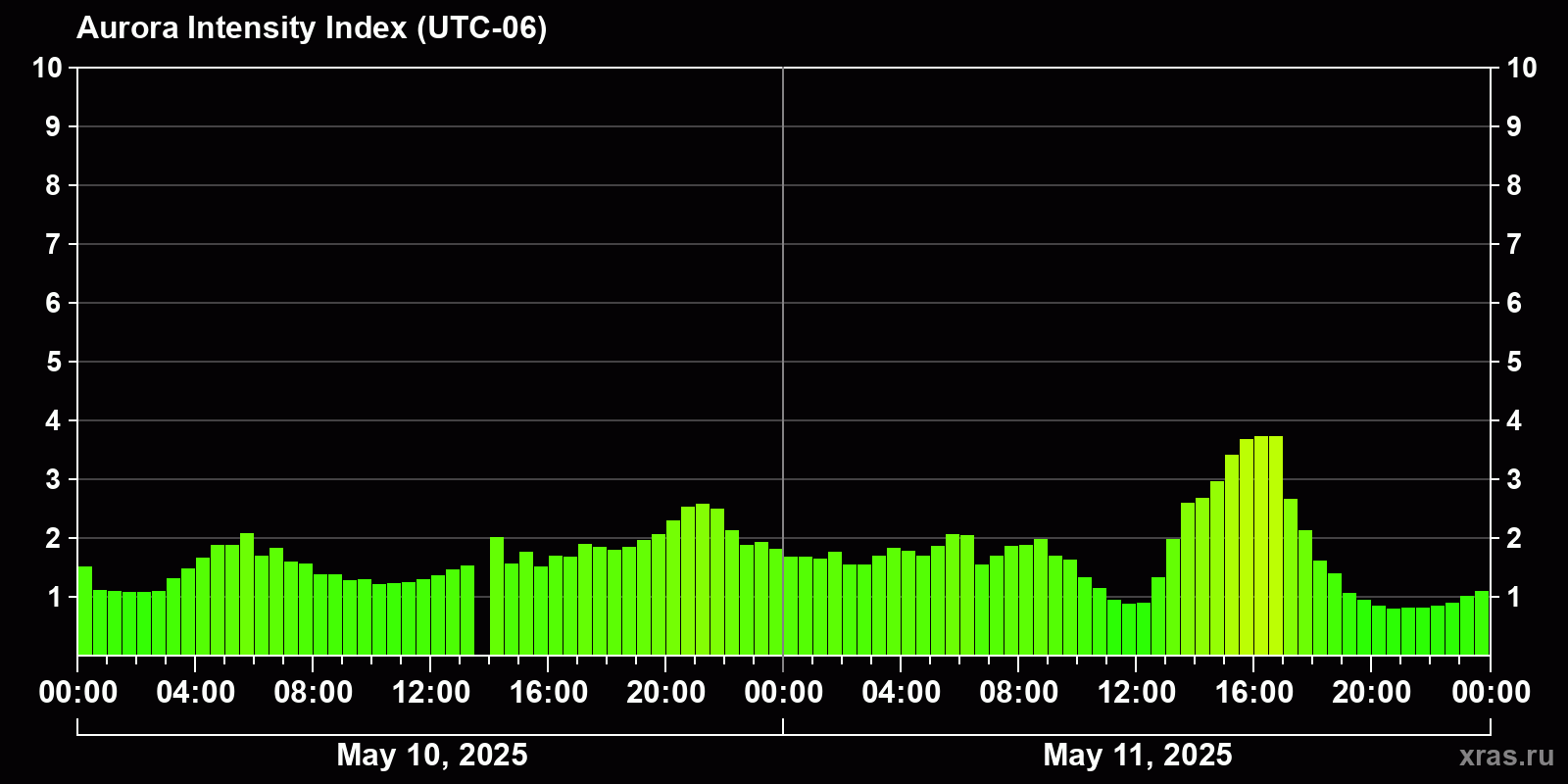 Changes in the auroral intensity index from 2025-05-10 to 2025-05-11 local time