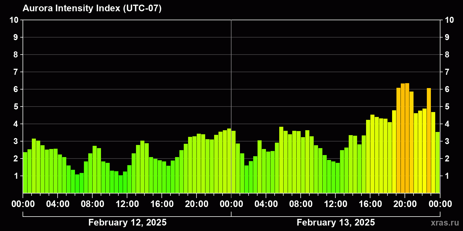 Auroral intensity index and the theoretically possible latitude of observations for nighttime in the Western Hemisphere as of 2025-02-13 23:49 (end of day) local time