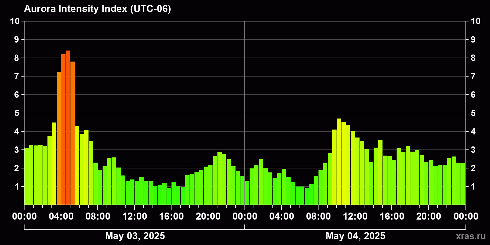 Auroral intensity index and the theoretically possible latitude of observations for nighttime in the Western Hemisphere as of 2025-05-04 23:51 (end of day) local time