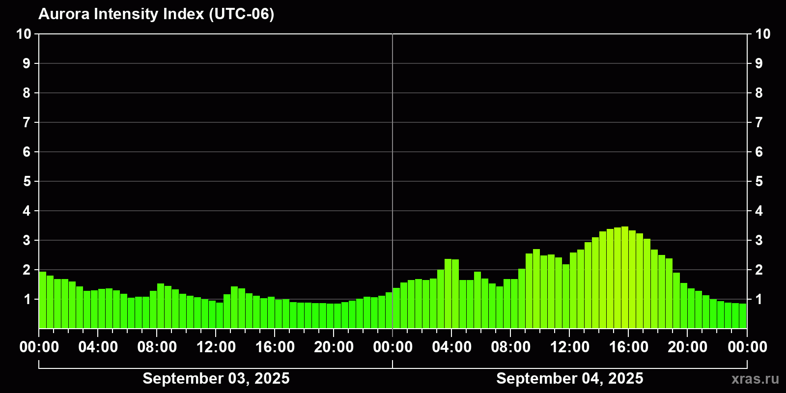 Changes in the auroral intensity index from 2025-09-03 to 2025-09-04 local time
