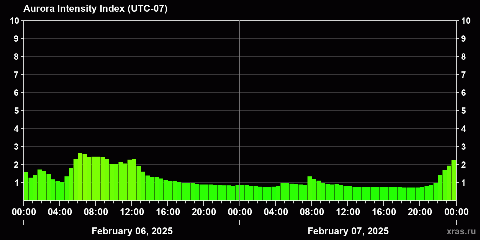 Auroral intensity index and the theoretically possible latitude of observations for nighttime in the Western Hemisphere as of 2025-02-07 23:45 (end of day) local time