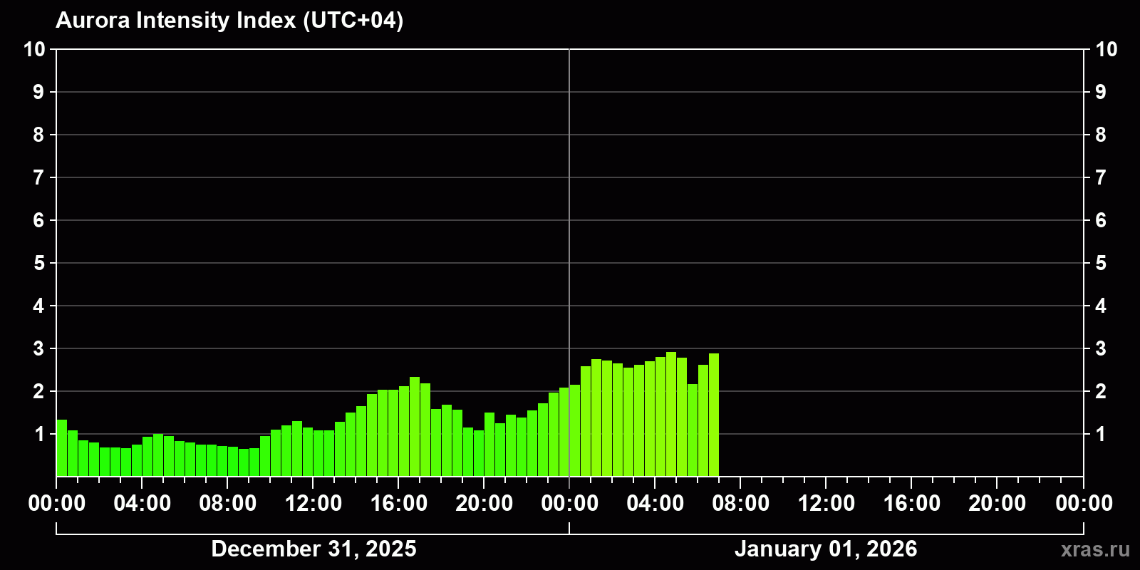 Auroral intensity index and the theoretically possible latitude of observations for nighttime in the Estern Hemisphere as of 2026-01-01 03:38 (end of day) local time