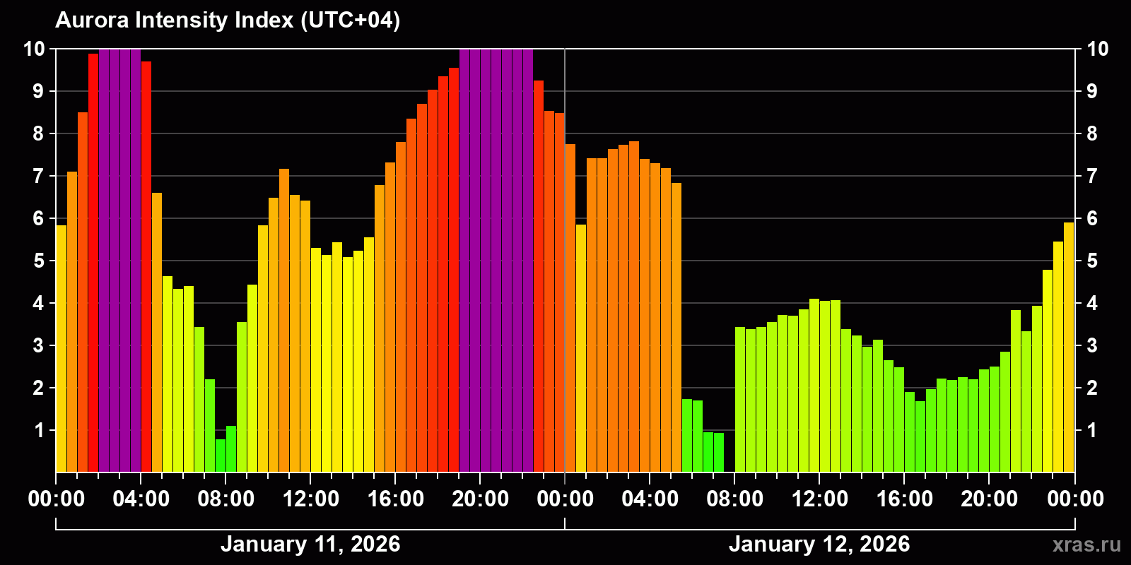 Auroral intensity index and the theoretically possible latitude of observations for nighttime in the Estern Hemisphere as of 2026-01-12 23:54 (end of day) local time