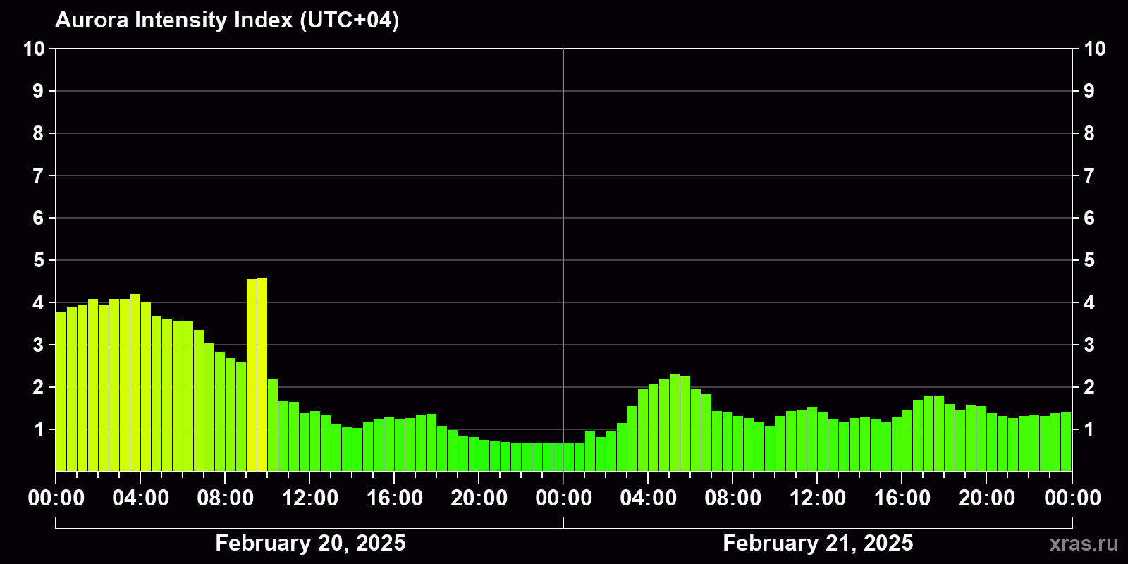 Auroral intensity index and the theoretically possible latitude of observations for nighttime in the Estern Hemisphere as of 2025-02-21 23:59 (end of day) local time