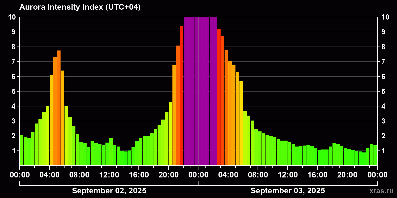 Changes in the auroral intensity index from 2025-09-02 to 2025-09-03 local time
