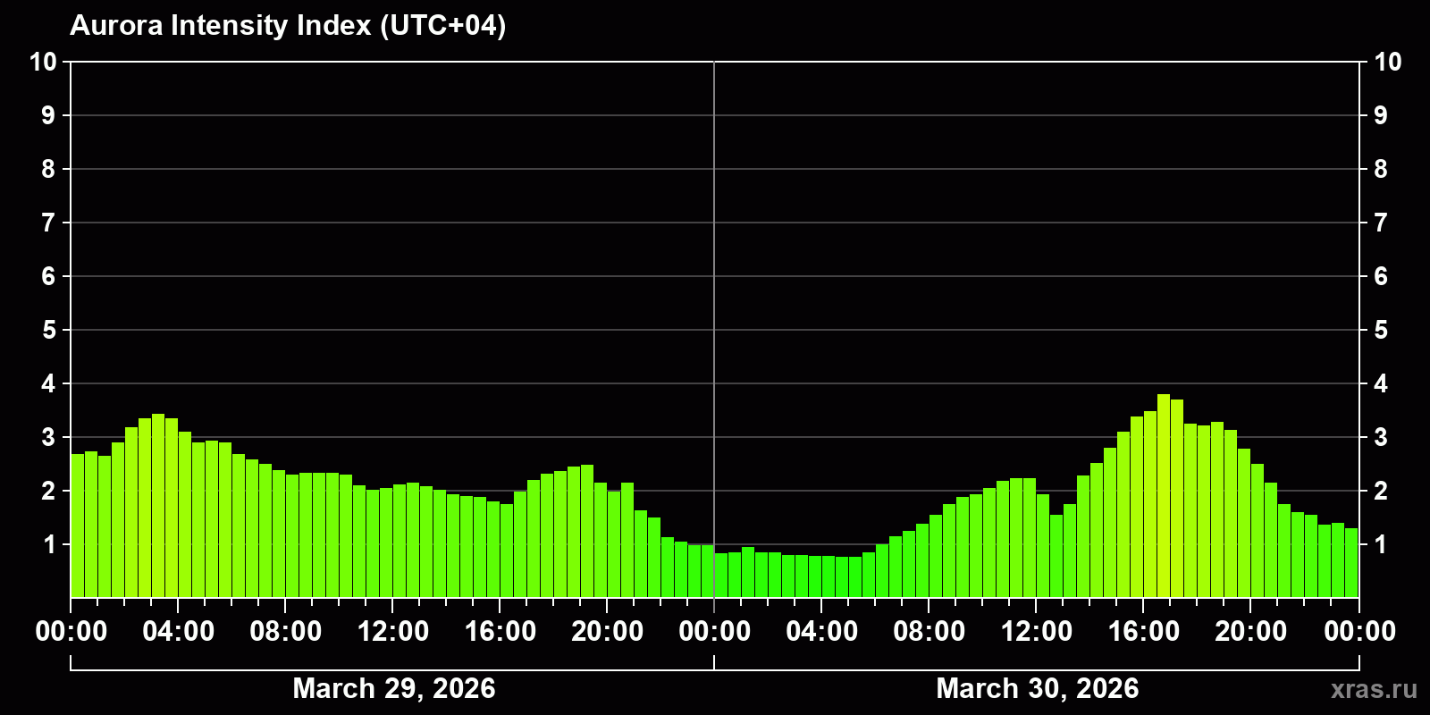 Changes in the auroral intensity index from 2026-03-29 to 2026-03-30 local time