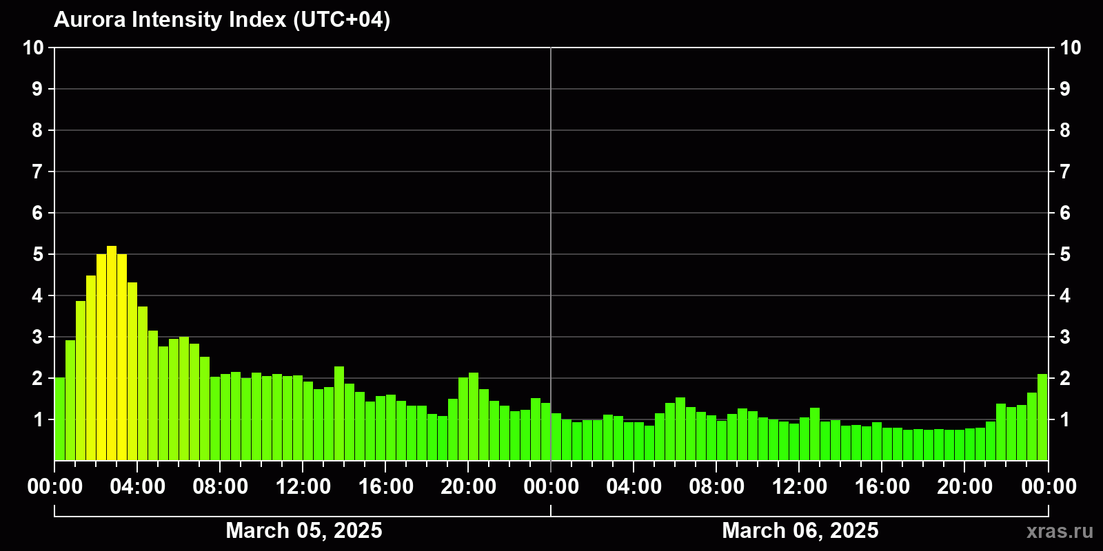 Changes in the auroral intensity index from 2025-03-05 to 2025-03-06 local time