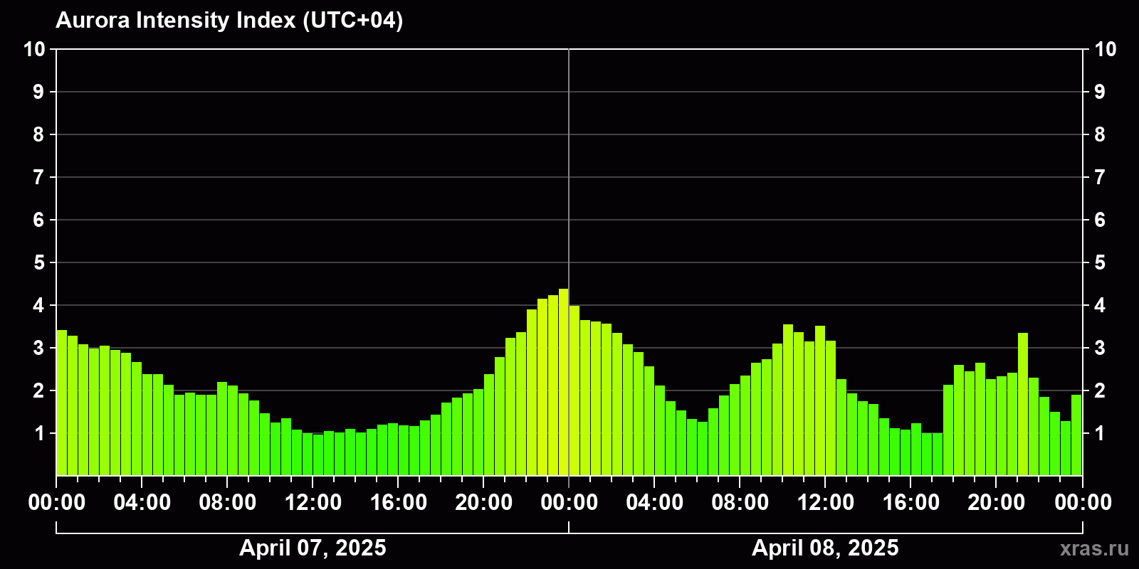 Auroral intensity index and the theoretically possible latitude of observations for nighttime in the Estern Hemisphere as of 2025-04-08 23:53 (end of day) local time