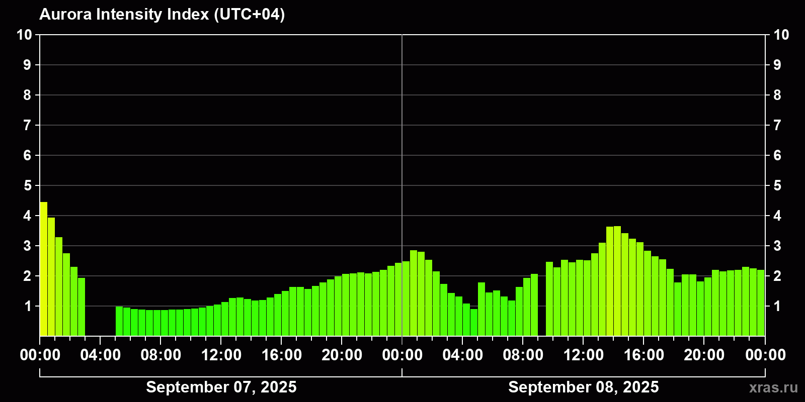 Auroral intensity index and the theoretically possible latitude of observations for nighttime in the Estern Hemisphere as of 2025-09-08 23:57 (end of day) local time