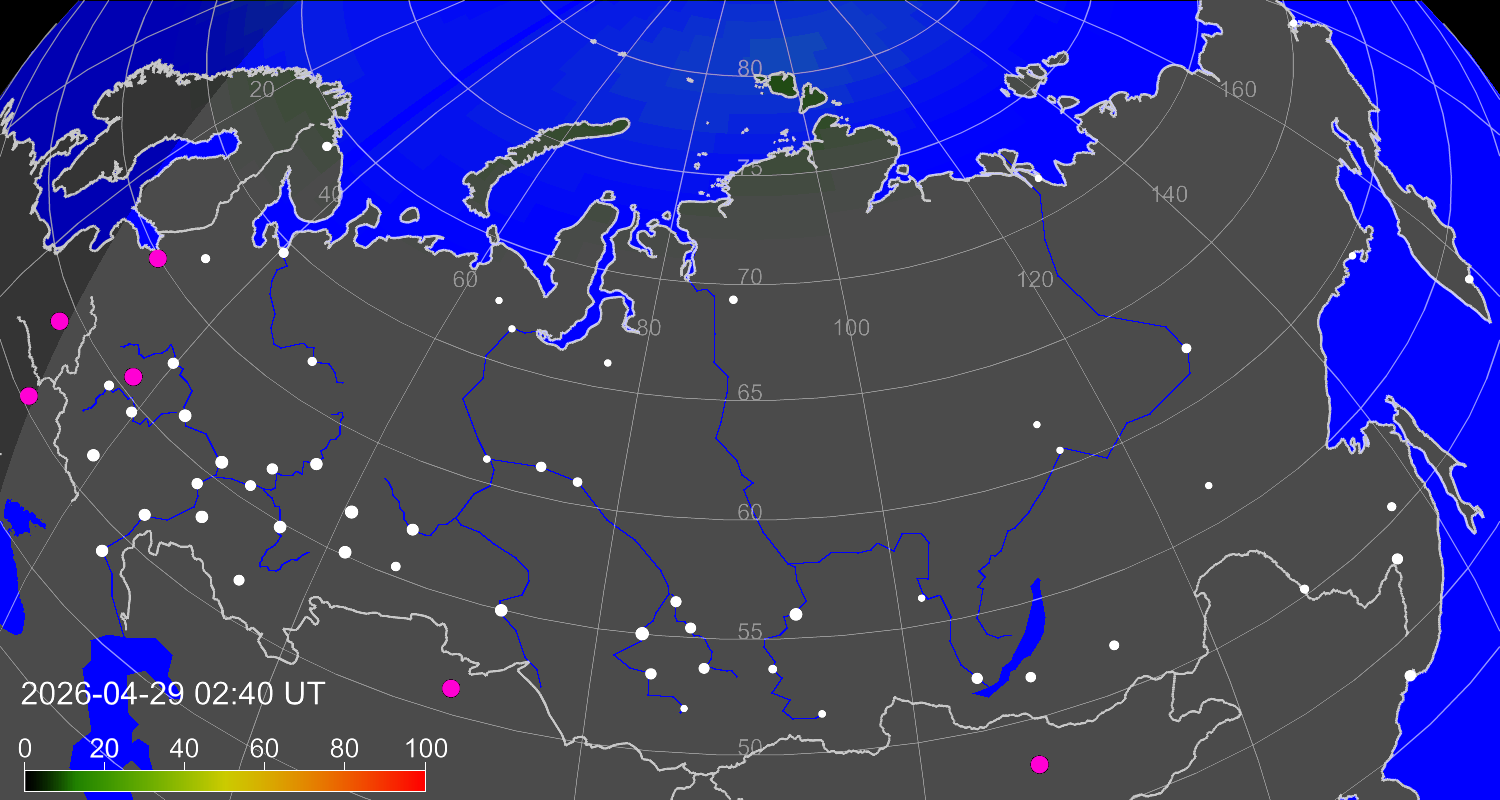 Probability of northern lights (auroras) in cities of Russia
