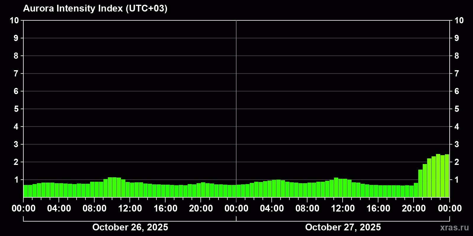 Auroral intensity index and the theoretically possible latitude of observations for nighttime in the Estern Hemisphere as of 2025-10-27 23:49 (end of day) local time