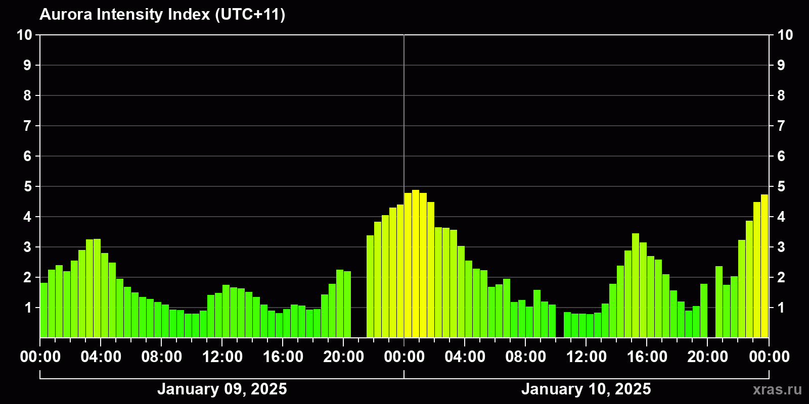 Auroral intensity index and the theoretically possible latitude of observations for nighttime in the Estern Hemisphere as of 2025-01-10 23:50 (end of day) local time