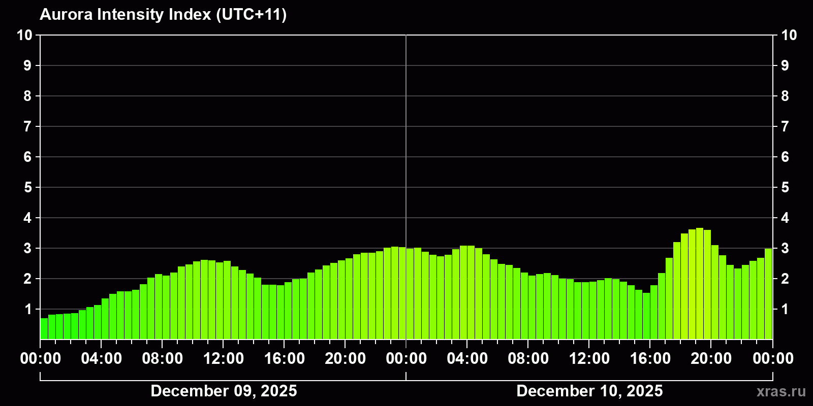 Auroral intensity index and the theoretically possible latitude of observations for nighttime in the Estern Hemisphere as of 2025-12-10 23:53 (end of day) local time