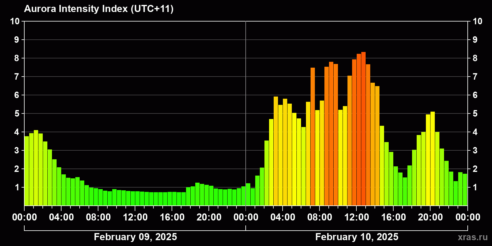 Changes in the auroral intensity index from 2025-02-09 to 2025-02-10 local time