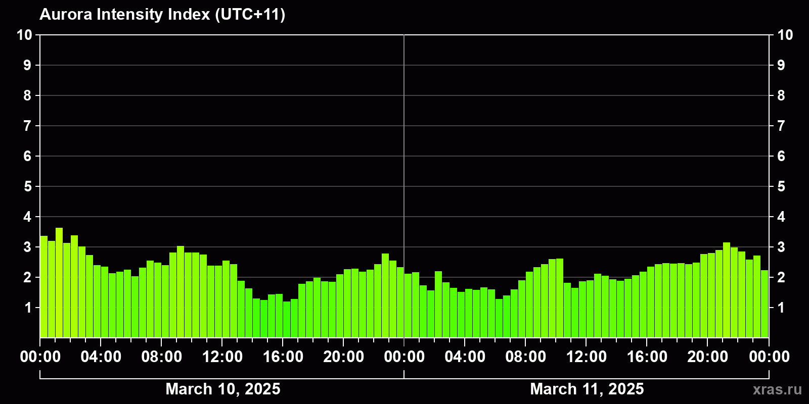 Auroral intensity index and the theoretically possible latitude of observations for nighttime in the Estern Hemisphere as of 2025-03-11 23:47 (end of day) local time