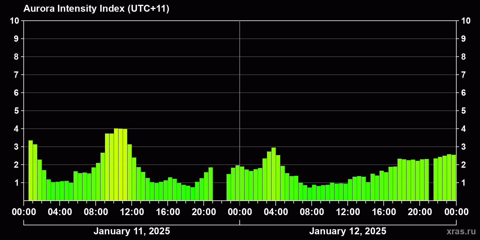 Changes in the auroral intensity index from 2025-01-11 to 2025-01-12 local time
