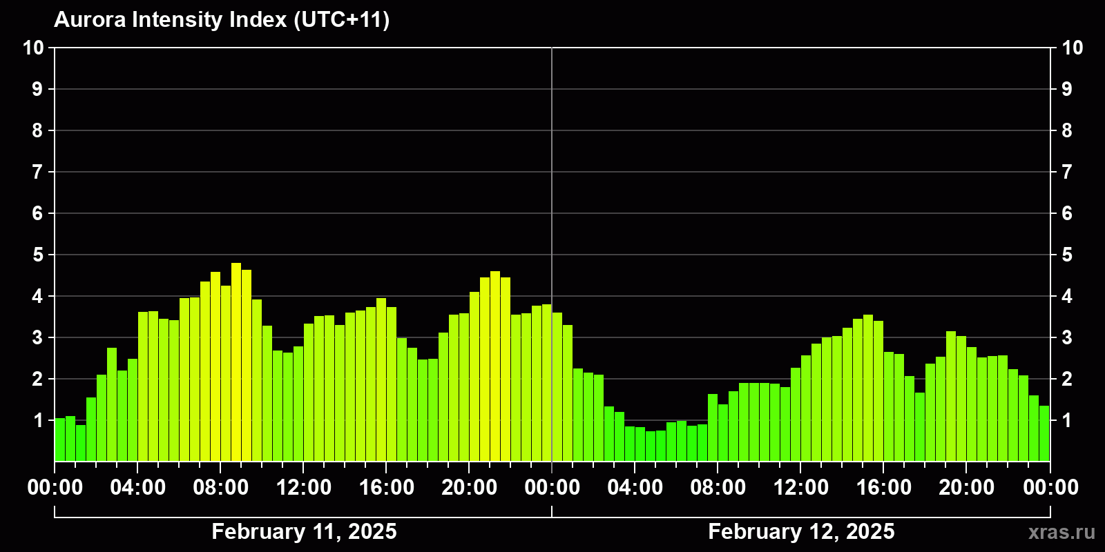Changes in the auroral intensity index from 2025-02-11 to 2025-02-12 local time