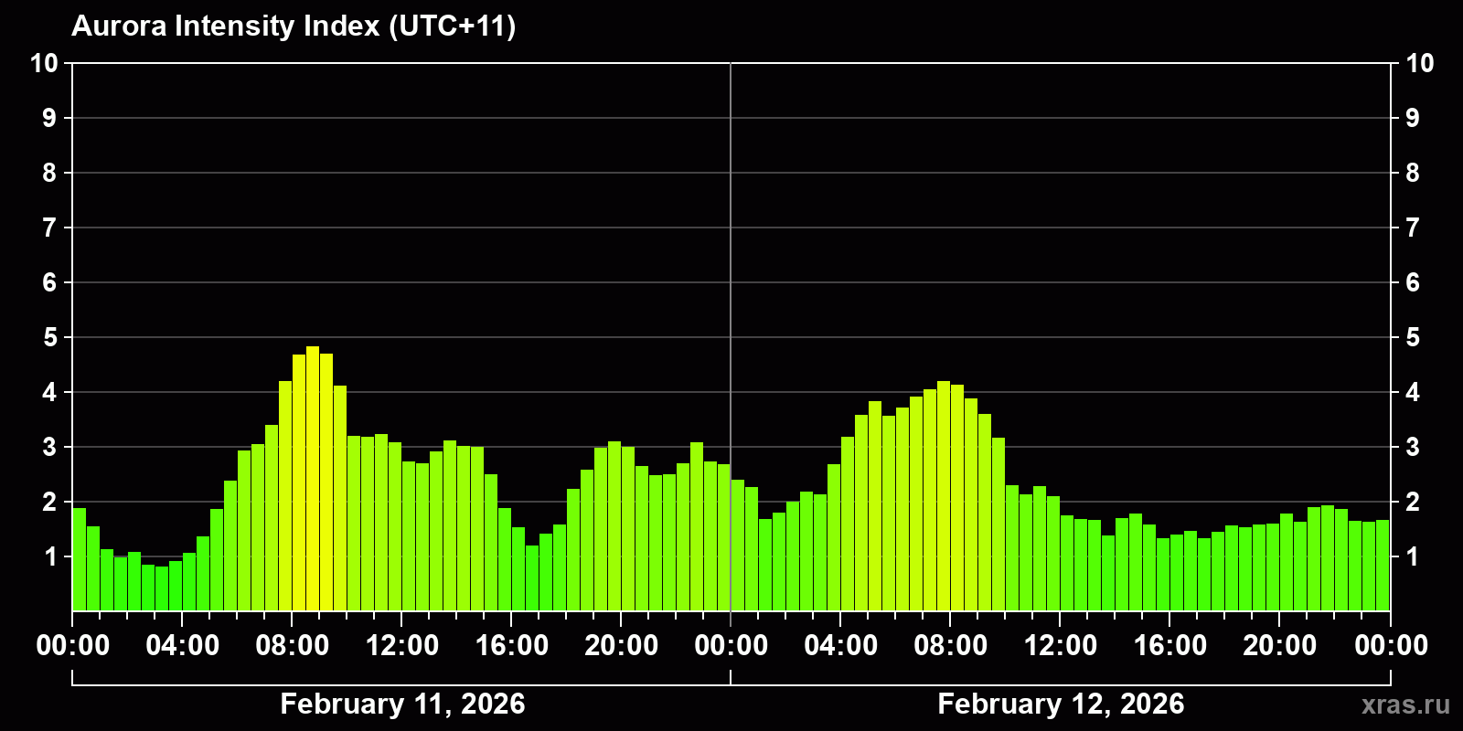 Changes in the auroral intensity index from 2026-02-11 to 2026-02-12 local time