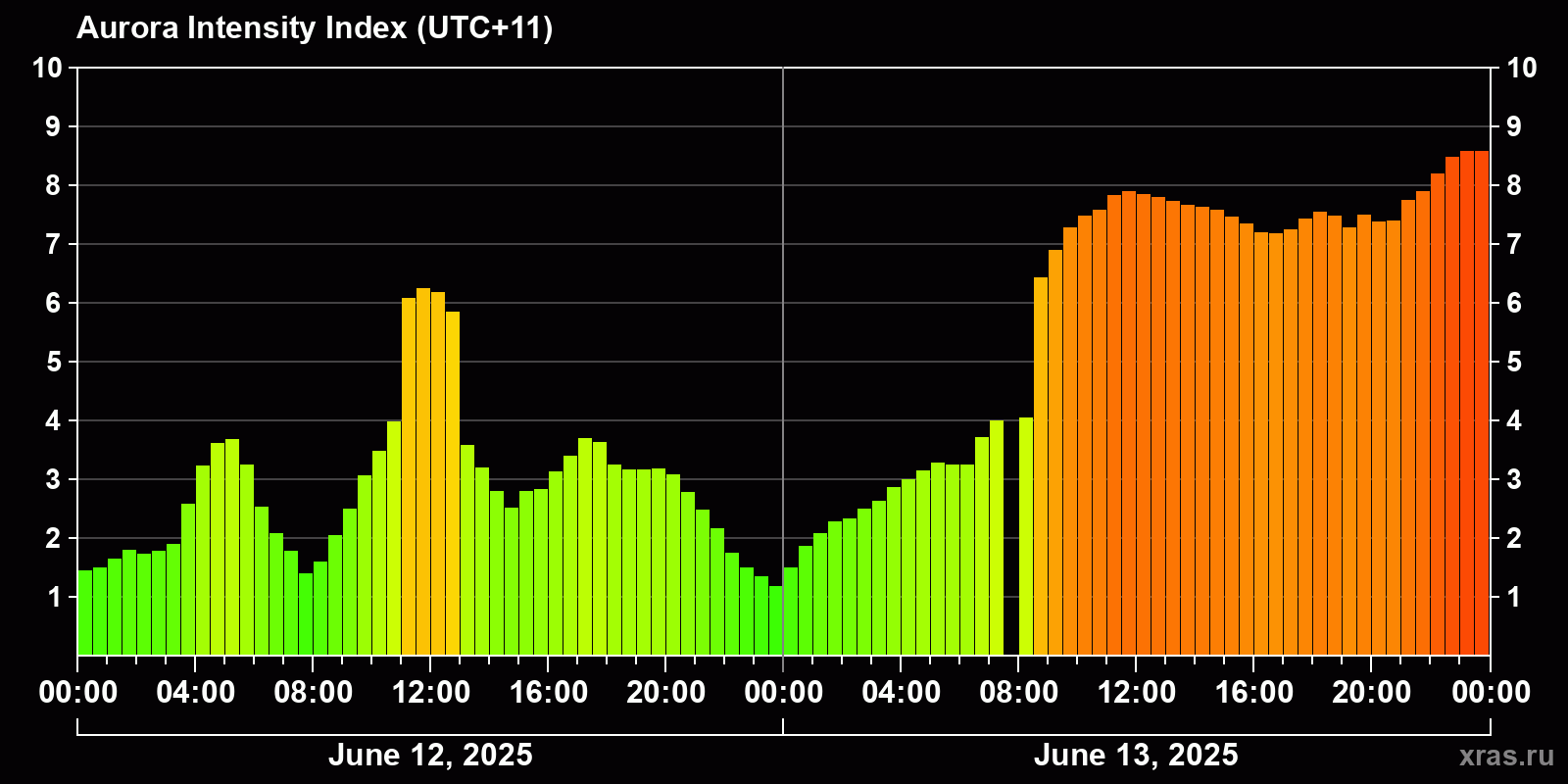 Changes in the auroral intensity index from 2025-06-12 to 2025-06-13 local time