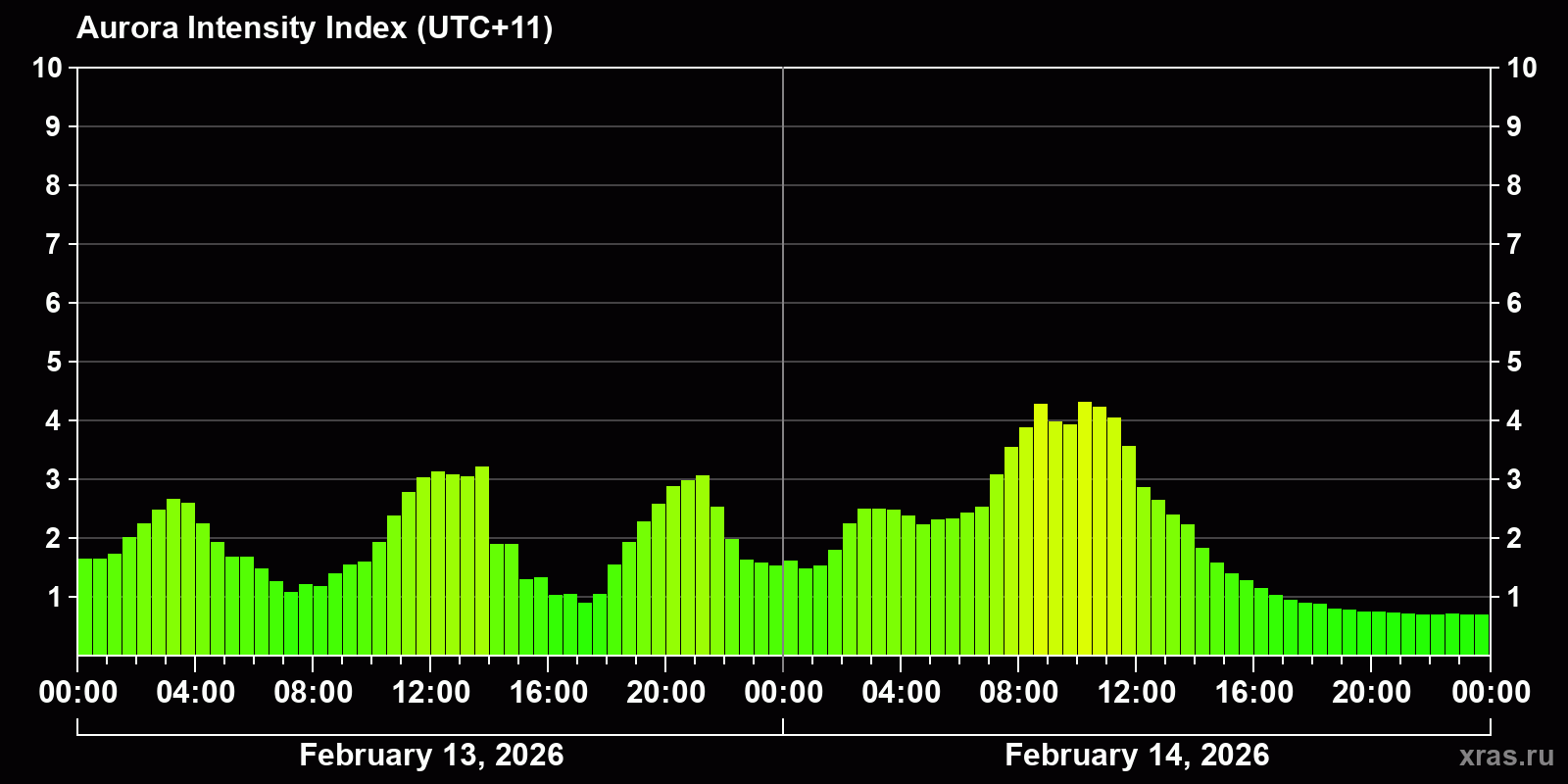 Auroral intensity index and the theoretically possible latitude of observations for nighttime in the Estern Hemisphere as of 2026-02-14 23:47 (end of day) local time