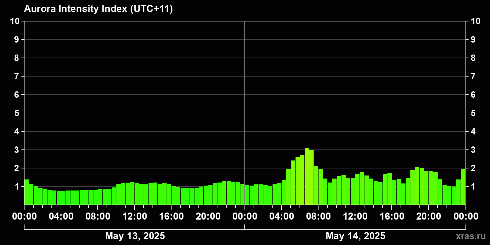 Changes in the auroral intensity index from 2025-05-13 to 2025-05-14 local time