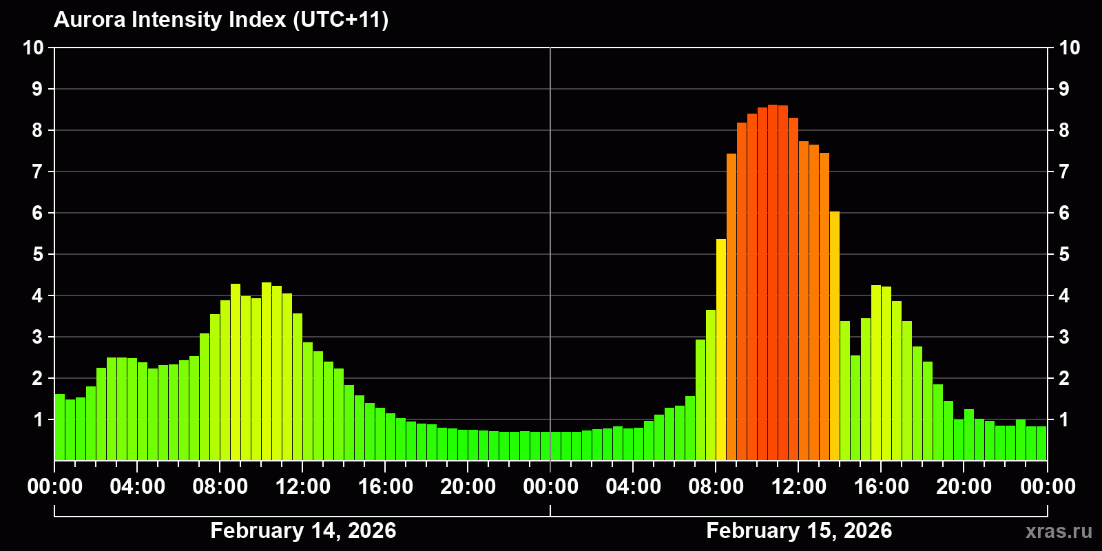 Changes in the auroral intensity index from 2026-02-14 to 2026-02-15 local time