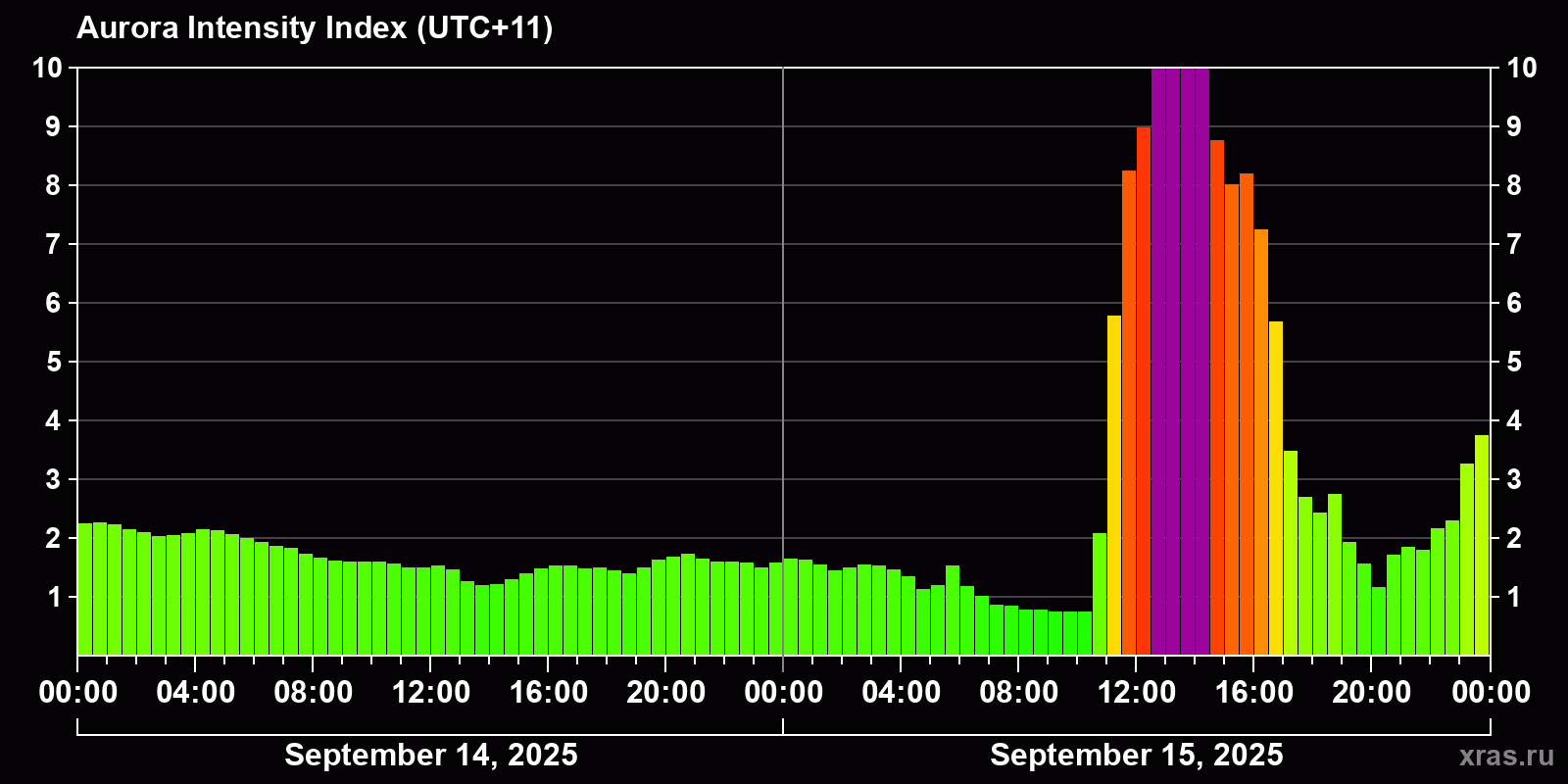 Changes in the auroral intensity index from 2025-09-14 to 2025-09-15 local time