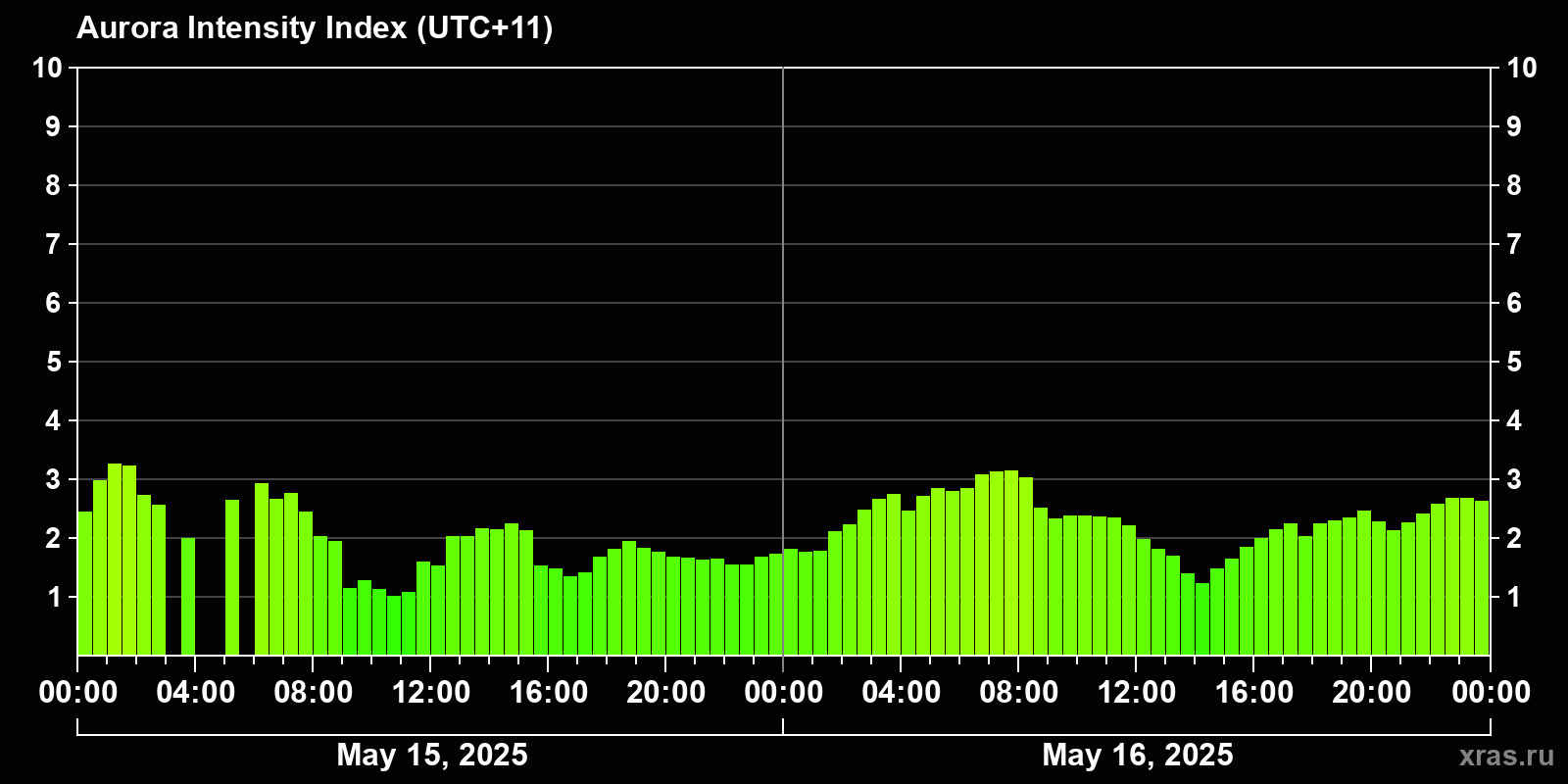 Auroral intensity index and the theoretically possible latitude of observations for nighttime in the Estern Hemisphere as of 2025-05-16 23:55 (end of day) local time