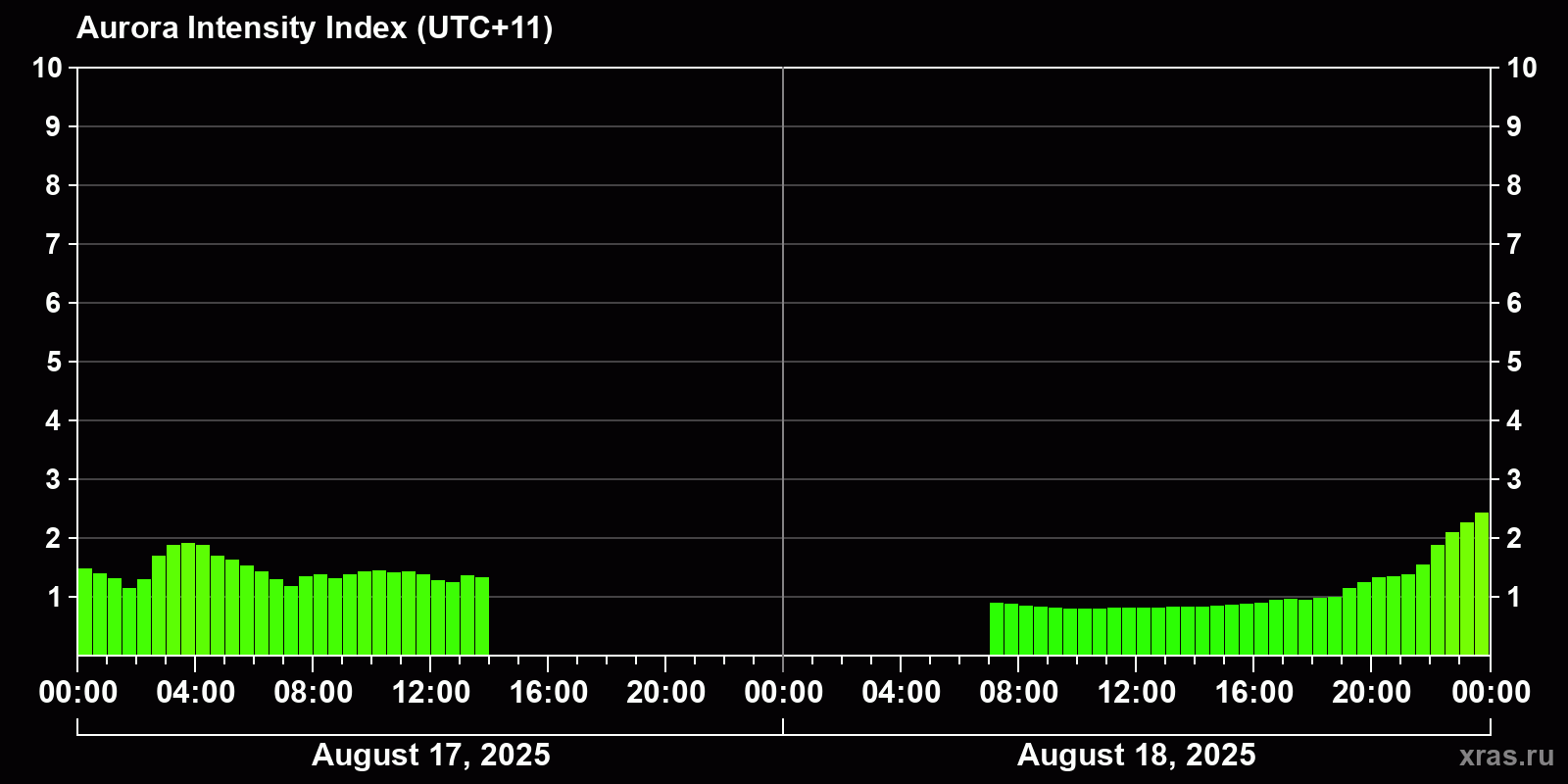 Changes in the auroral intensity index from 2025-08-17 to 2025-08-18 local time