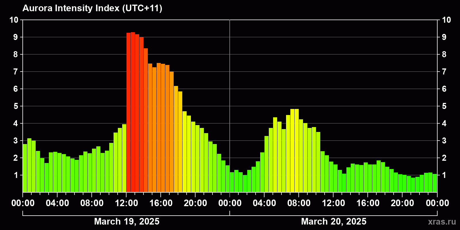 Changes in the auroral intensity index from 2025-03-19 to 2025-03-20 local time