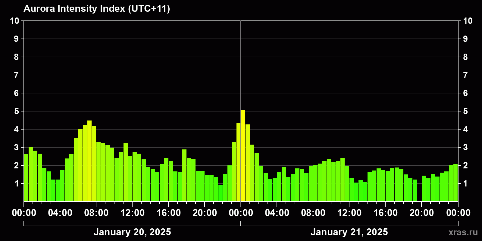 Changes in the auroral intensity index from 2025-01-20 to 2025-01-21 local time