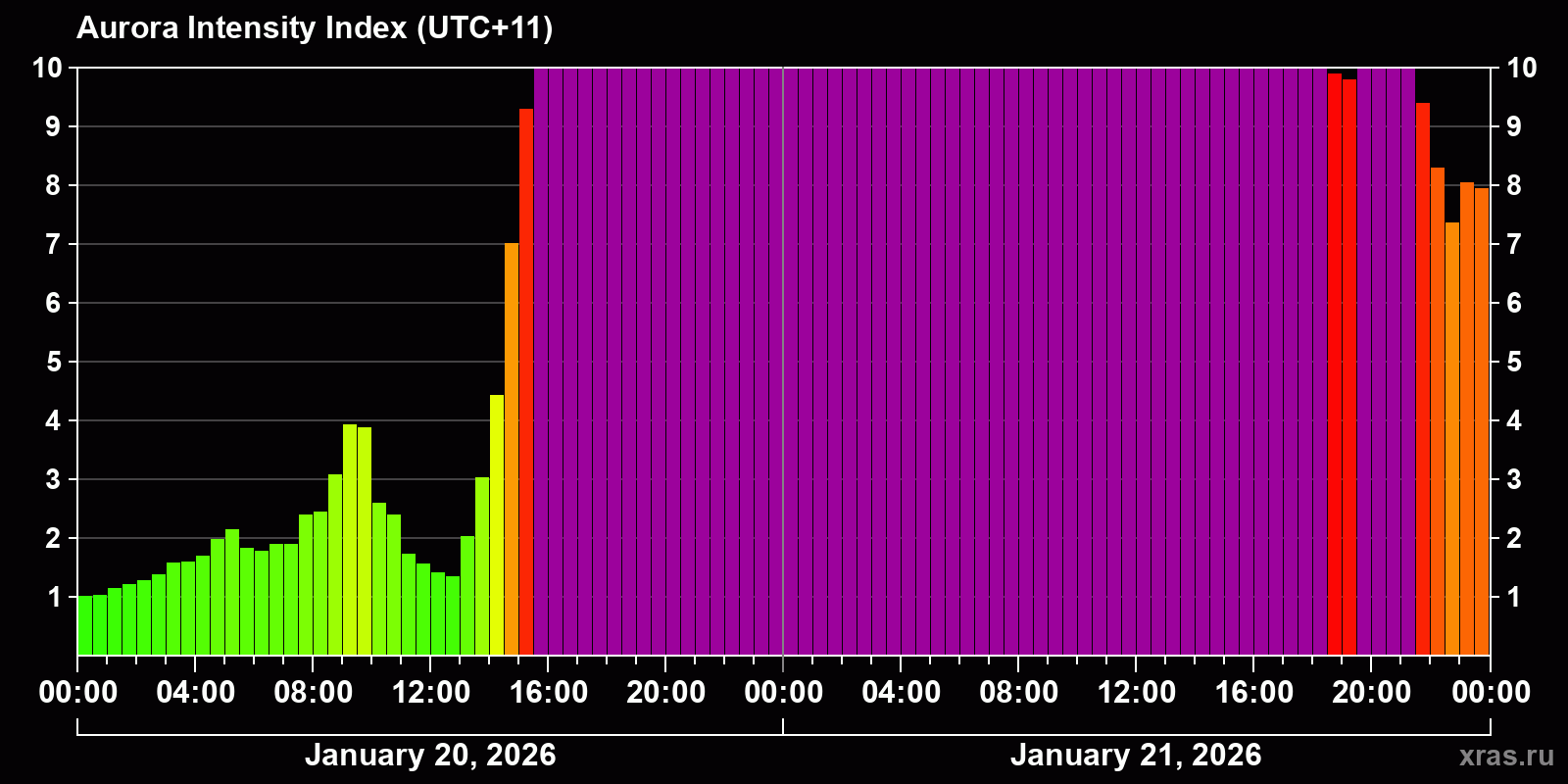 Changes in the auroral intensity index from 2026-01-20 to 2026-01-21 local time