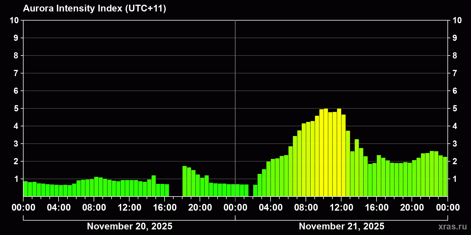 Changes in the auroral intensity index from 2025-11-20 to 2025-11-21 local time