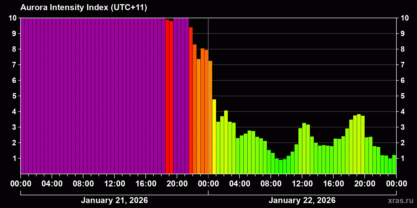 Changes in the auroral intensity index from 2026-01-21 to 2026-01-22 local time