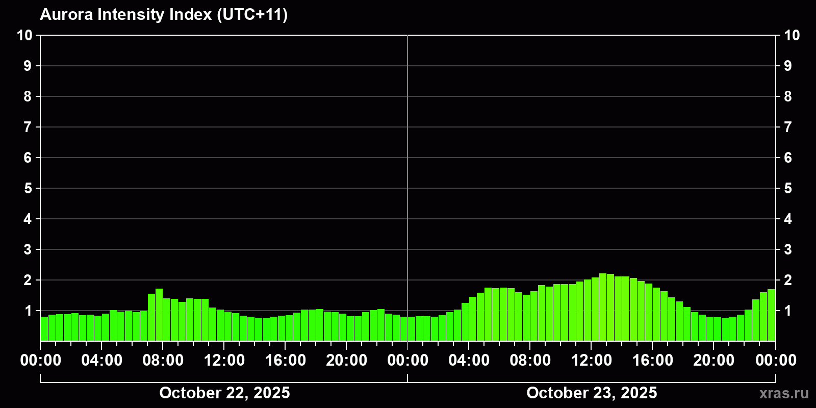 Changes in the auroral intensity index from 2025-10-22 to 2025-10-23 local time
