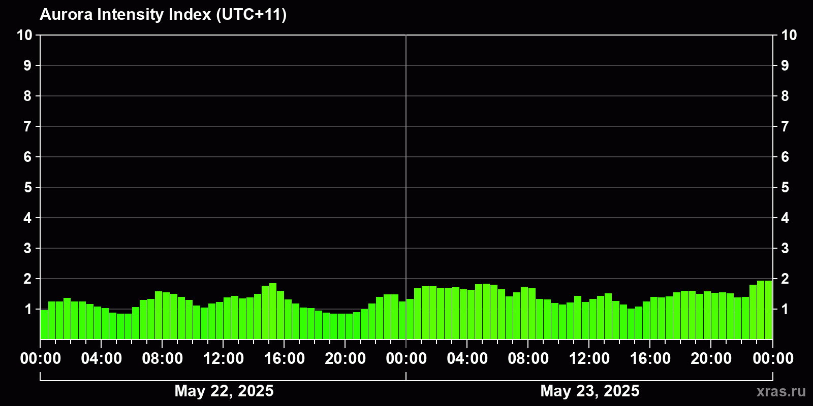Auroral intensity index and the theoretically possible latitude of observations for nighttime in the Estern Hemisphere as of 2025-05-23 23:54 (end of day) local time