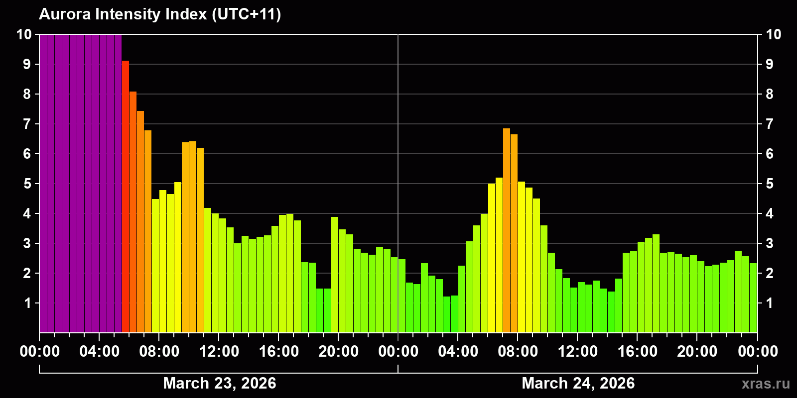 Auroral intensity index and the theoretically possible latitude of observations for nighttime in the Estern Hemisphere as of 2026-03-24 23:58 (end of day) local time