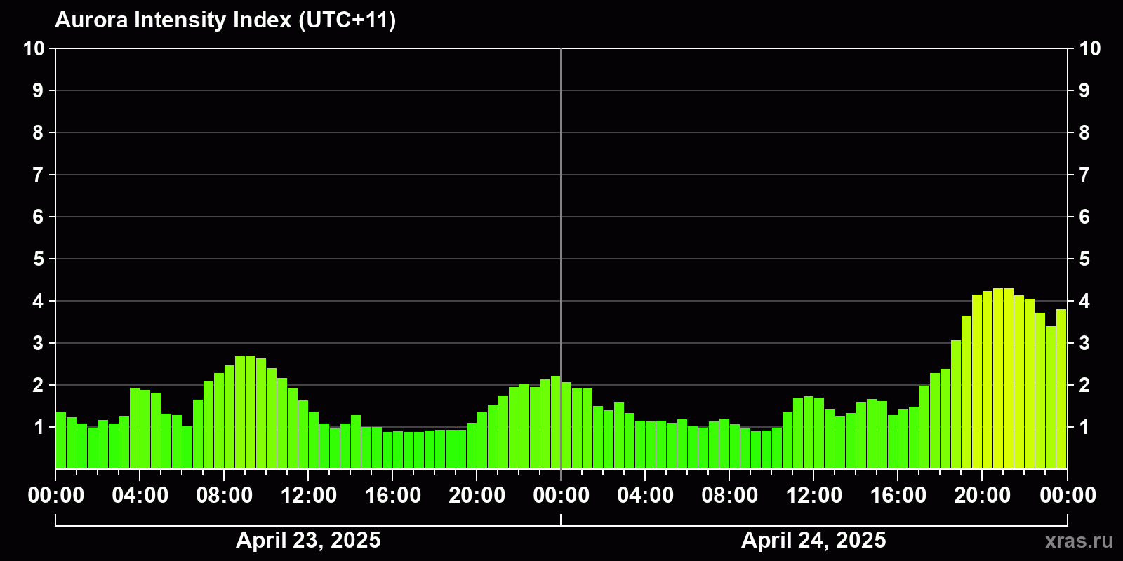 Auroral intensity index and the theoretically possible latitude of observations for nighttime in the Estern Hemisphere as of 2025-04-24 23:53 (end of day) local time