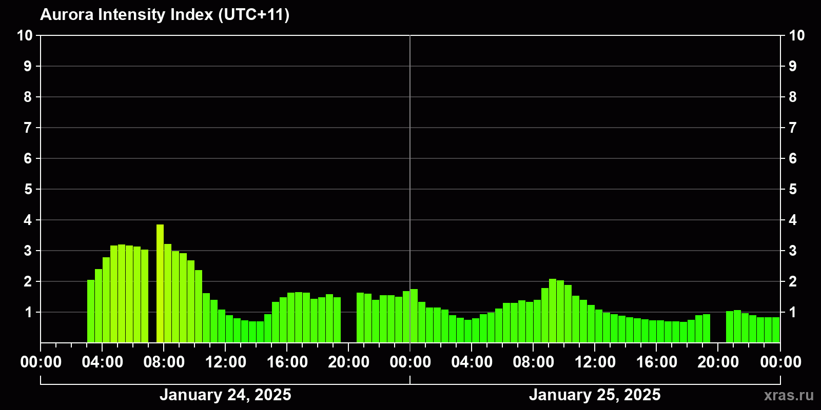 Auroral intensity index and the theoretically possible latitude of observations for nighttime in the Estern Hemisphere as of 2025-01-25 23:49 (end of day) local time