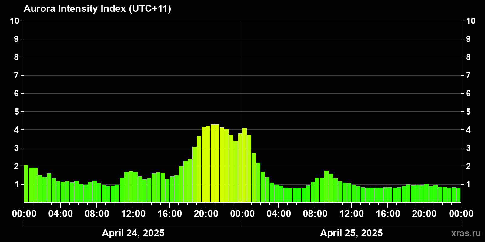 Auroral intensity index and the theoretically possible latitude of observations for nighttime in the Estern Hemisphere as of 2025-04-25 23:55 (end of day) local time